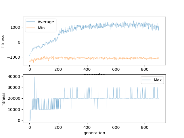 This means that each child is 40% different from its parent and 13% of the weights and biases are more than 100% different. This is probably too much to allow for consistent evolution. As you can see, the minimum never increased beyond -1000. This suggests me that even though the worst performers were culled in every generation, new worst performers were generated every generation. When watching visually, I observed a significant number of individuals which were not making any moves and just stacking pieces on top of each other.
